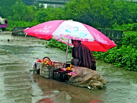 ▲23日,大雨,西客站附近的王府大集,来自仲宫的63岁果农张庆美躲在伞下,看守着桃子和鹅蛋,巴望着雨中匆匆走过的行人,虽紧裹着厚厚的外衣,仍冻得瑟瑟发抖。雨一阵紧似一阵地下着,平常两千多个摊位的大集,此时只有零星几人。行人经过,看到雨中的张庆美,再大的雨也停下来买上几个桃。低矮的伞,撑起了雨中生计;雨中归人,撑起了城市的暖。 本报见习记者 郭立伟 摄