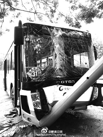 本报6月23日讯(记者 化玉军) 6月23日下午1点左右,在北京路与五莲路交会口附近,一辆自南向北行驶的31路公交撞上信号灯,造成车头损坏,前挡风玻璃碎裂。
