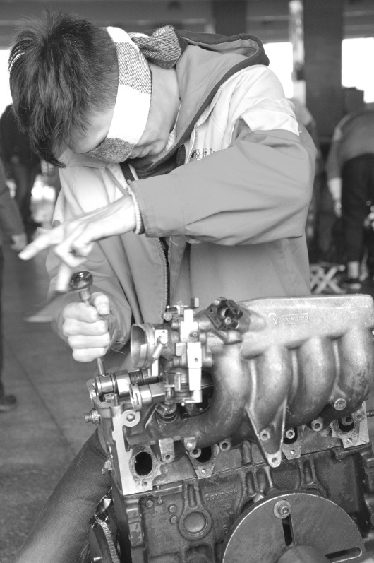 蓝翔技校的一名学员在表演盲拆发动机。(资料片)