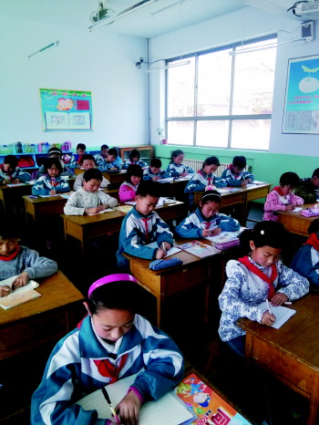沂源县悦庄镇埠村希望小学对学生进行读写姿势的强化训练。(任会美 崔君玉)