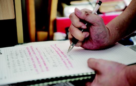 ▲老朱每首诗都是如此握笔,每个字要花差不多一分钟。