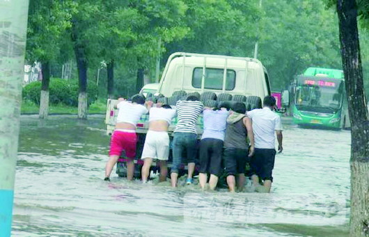 3日下午,一辆小货车驶入黄冈路北段积水地段时熄火,几位市民一起把车推了出来。 视频截图