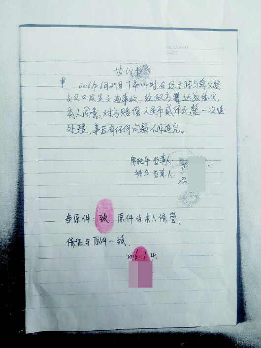 事故后双方签订私了的协议。 本报记者 王兴飞 摄