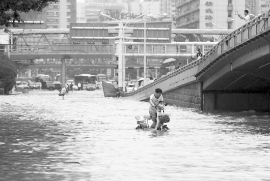 7月6日,市民在武汉街头涉水而行。新华社发