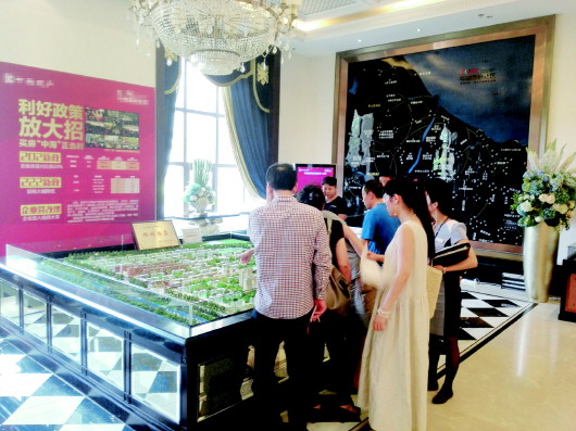 在烟台城区一楼盘,不少市民前来看房,销售商的广告上打着“利好政策放大招”。 本报记者 秦雪丽 摄