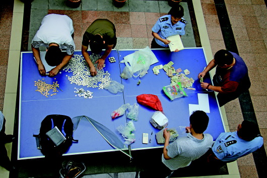 ◤民警在清点李某盗取的现金。