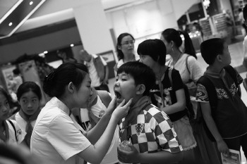 来自雅悦口腔的的医务志愿者为孩子们检查牙齿普及爱牙知识。