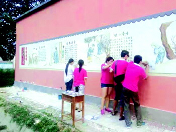 本次社会实践活动的主要内容是为三合庄村设计制作文化墙,文化墙共长近60米,高近5米,总面积约为300平方米。墙体彩绘不同于在纸上做画,尤其是在高近5米的墙上,其难度是可想而知的。18人的彩绘小组不怕苦不怕累,面对酷暑,虽汗流浃背,但没有一个人退缩。终于在大家的协同配合下,近60米长的二十四孝图等共二十六幅作品,于7月8日上午全部完工,并顺利通过验收。看着这面形象墙,同学们露出了满意的笑容,过往的村民们也给同学们竖起了大拇指。