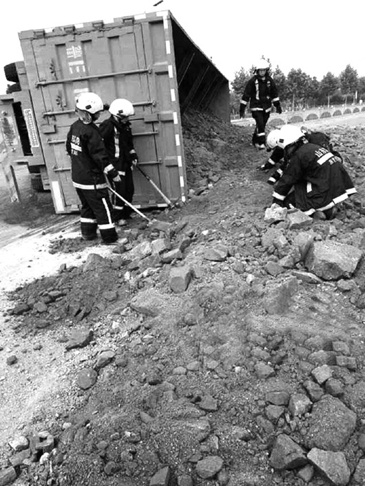 本报东营7月17日讯(记者 聂金刚 李玉亮) 17日上午,东营市广饶县綦公路与永安路路口发生车祸,一辆渣土车侧翻,泄出的砂石埋了一辆三轮摩托车,致九人死亡。