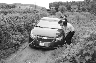 15日下午,山亭区降大暴雨,一辆挂临沂牌照的红色雪佛兰轿车行驶途中不慎陷入路侧淤泥中。中途司机试图加大油门开出来,没想到折腾一个多小时,车越陷越深,无奈之下报警求助。经过半小时的紧急救援,司机终于得以解困。 本报通讯员 门成晓 本报记者 王开元 摄影报道