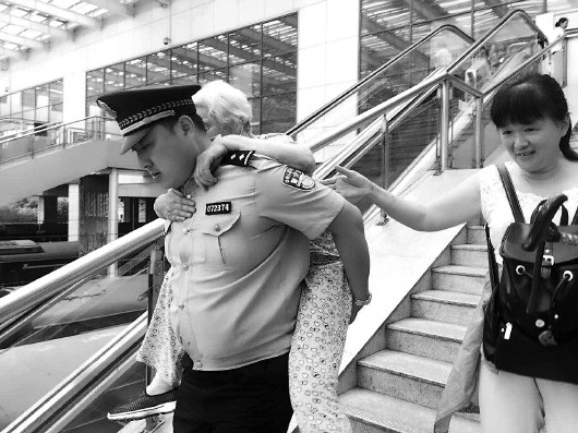 王群的母亲稍胖,姐姐根本背不动,只好搀着老人一点一点挪动,眼看就要晚点,就在这时,一位胖胖高高穿着警服的民警走过来,背起老太太走下长长的台阶,又走过长长的站台,一直把她背到车厢。