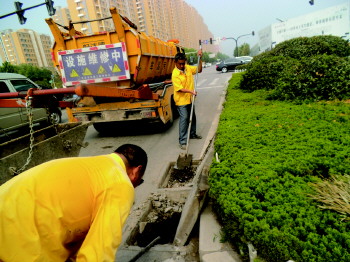 市政工人正在清挖雨水篦子。 通讯员 王红 摄