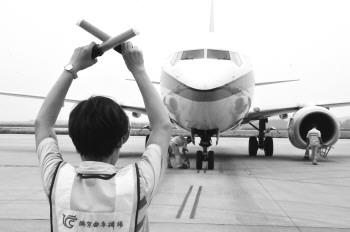 ◤机务人员冒着高温指挥飞机停靠。本报记者 张晓科 摄