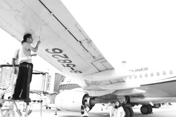 清除飞机机翼小故障。本报记者 张晓科 摄
