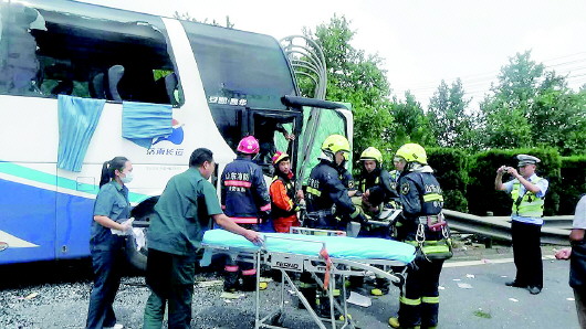 客车上一名男子受伤,民警、消防人员将男子从破碎的窗户处救了出来。目前,交警部门正在对事故原因做进一步调查。