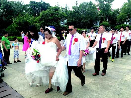 9日是中国传统节日七夕节,在英雄山赤霞广场,13对残疾人步入婚姻殿堂。据济南市残联工作人员介绍,此次是为2015年以来的残疾人新婚家庭集中举办的一次婚礼,夫妻双方至少有一方是残疾人。本次活动得到济南市20余家爱心企业(单位)的参与和支持。 本报记者 王杰 摄影报道