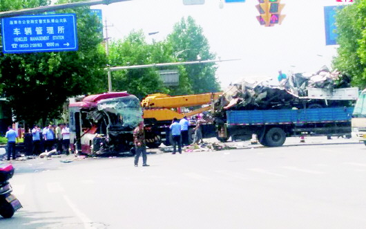 8月11日8时23分,一辆鲁N90876牌照低速货车沿淄博市博山区北山路由西向东行驶,货车行驶至博沂路掩的村路口时,先后与沿博沂路由北向南行驶的一辆公交车、一辆大客车、一辆小型客车及一辆二轮摩托车相撞。