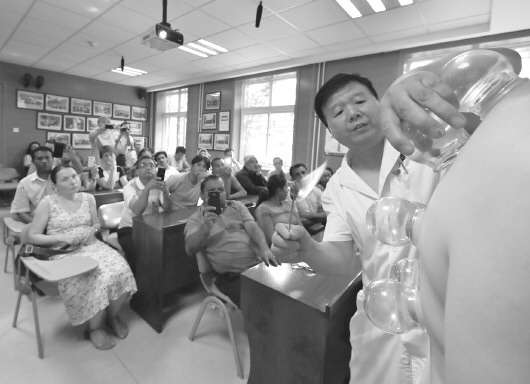 8月12日,北京中医医院的大夫为亚欧国家传统医学管理研修班的学员演示拔罐。 新华社发