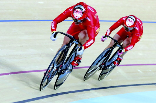 头盔上的国粹京剧脸谱图案与中国自行车一起,见证金牌,见证新纪录。 新华社发