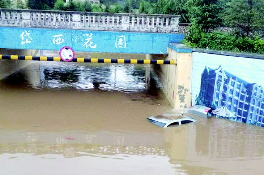 16日中午12点左右,急雨过后,泰安市岱西花园铁路桥下积水变浅,被淹轿车才露出水面。