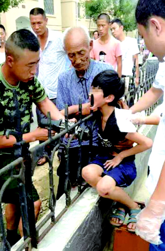因为重力过猛,童童的下巴被铁栅栏的三角尖头部位直接刺透,不断渗出血来。一旁的童童爷爷很着急,拨打了119,消防队员紧急赶到现场,轻手轻脚地在四个角固定住铁栅栏,用液压钳将周围的铁栅栏剪断,使覆盖在童童身上的重量减小,以减轻伤口处的疼痛感。