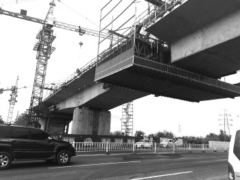 横跨山海路的连接梁即将合龙。 本报记者 化玉军 摄
