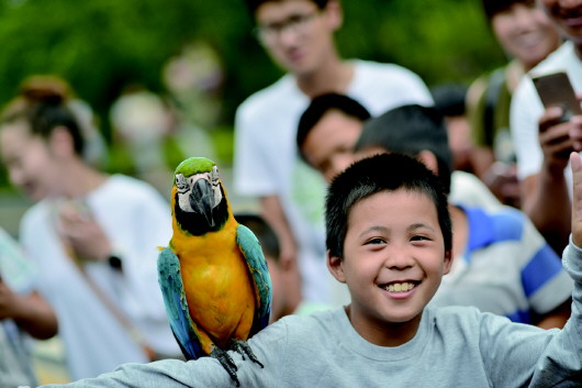 如此近距离地接触美丽的鹦鹉,来自枣庄后枣村的李秋运既紧张又兴奋。 本报记者 陈文进 摄