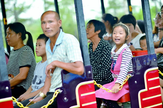 来自德州夏津李楼村的陆晴(右一戴发卡女孩)第一次体验坐小火车的感觉,开心极了。 本报记者 陈文进 摄