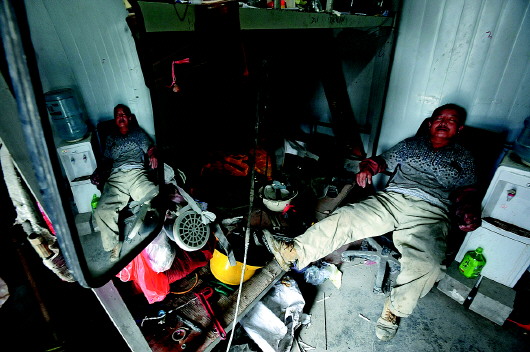 ▲罐内不仅脏,有时温度得40℃以上,所以清理工作十分消耗体力,工作之余他就守着工具眯一会儿。