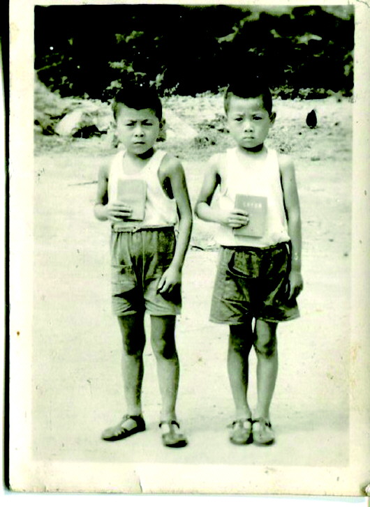 母亲从邻居那里借来了背心、凉鞋给我们换上,学校老师又给了两本“红宝书”做道具,我和哥哥便留下了人生的第一张照片,我(右)和哥哥当时特紧张,你看照片上我俩皱紧眉头的样子,有趣不?