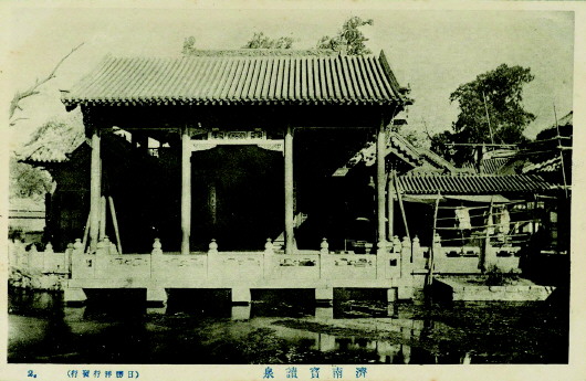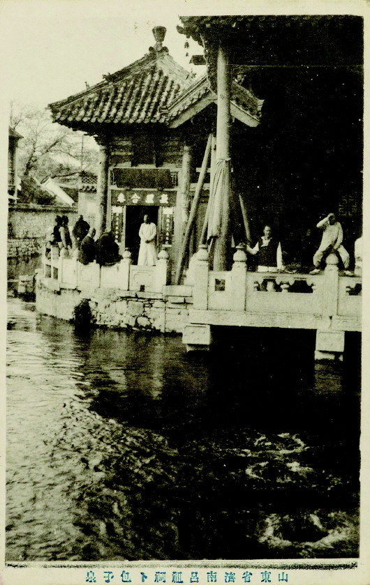 这一点,从济南人的口语里就能加以印证——许多老济南人都习惯将“趵突泉”读作bào dū quán,“突”字多读为dū。这一读音在近代明信片上也有体现,1910年日胜洋行所发行的一张明信片上,将标题“趵突泉”写作“宝读泉”,这记录的正是济南土话读音。后来,随着济水故道的湮没,“爆渎泉”在济南人的口语中又逐渐演变为“包子泉”,民国初年的明信片上也可以见到这种写法。
