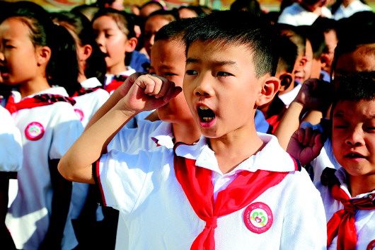 汇泉小学宣誓“女排精神”。 本报记者 支倩倩 摄