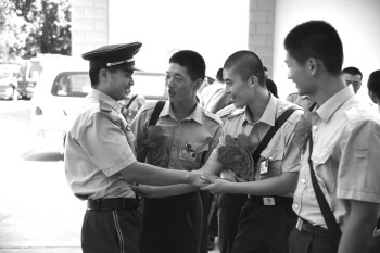 9月1日,德州武警支队首批退伍老兵告别生活和战斗两年多的警营,在战友的欢送下踏上返乡路程。 本报记者 马志勇 摄