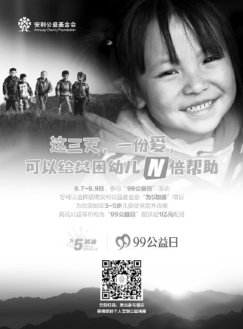 今年安利公益基金会推出“营养扶贫战略”,从儿童营养改善入手,通过切断贫困代际传递的链条、助力中国社会消除贫困,安利公益基金会全新的公益项目“为5加油——学前儿童营养改善计划”,将为贫困地区3-5岁儿童提供关键的营养改善支持,2016年该项目已在5个省500多所幼儿园开展,受益儿童达1万名。该项目成功入选2016年度腾讯99全民公益日活动。这意味着,从9月7日至9日,你给“为5加油”项目的每1笔捐款都能获得腾讯超1:1配捐。仅此3天,腾讯公益平台配捐总额超2亿,每天9点开始,配额有限,抢完即止!让我们帮“为5加油”项目一起筹得100万元善款,获得200万的配捐,完成300万众筹目标,让4285名贫困地区儿童获得新一学年的全面营养支持。