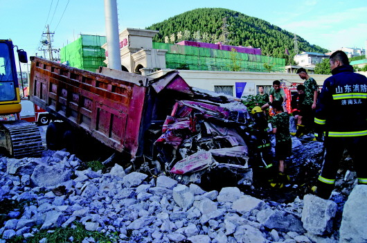 凌晨,快速行驶的摩托车追尾路边停放的大货车,摩托车卡在大货车双排轮之间,两小伙当场身亡。运载碎石的大货车怪坡路段失控,连撞多辆车后撞倒绿化带里的电线杆,车头几乎被倾斜而下的石块挤平,驾驶员被困驾驶室内当场身亡。8月份,济南市区至少发生6起涉及大货车的惨烈交通事故,7人身亡。