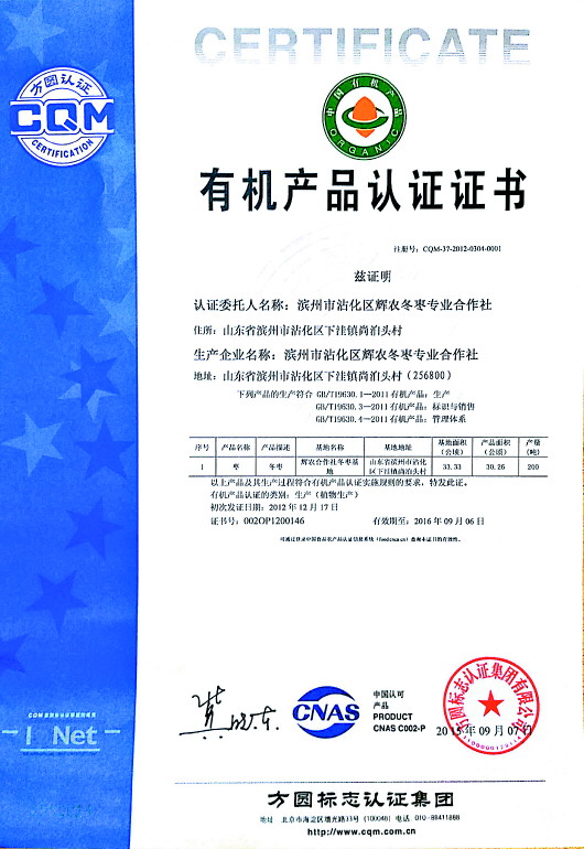 ◤本报售卖冬枣的有机认证证书。