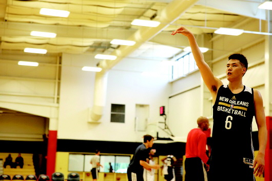 ◥身穿鹈鹕队训练服的贺天举正在苦练。 Osports供图