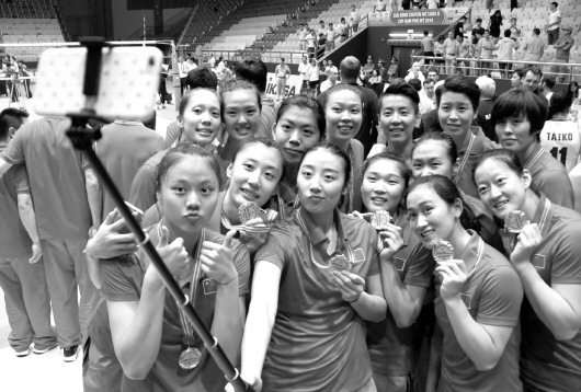 中国女排队员在颁奖仪式后自拍合影。 新华社发