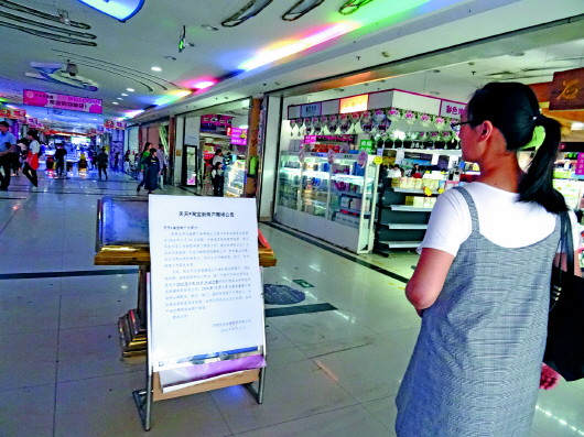 天天淘宝街月底撤场的公告就贴在进门显眼位置。 本报记者 左庆 摄
