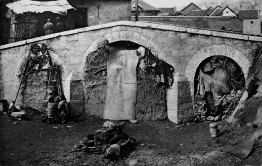▲济南,准备从山东前往东北的饥民的住处:一座桥的桥洞被改造成了住屋,门口用布帘或草席遮挡。(1928年)