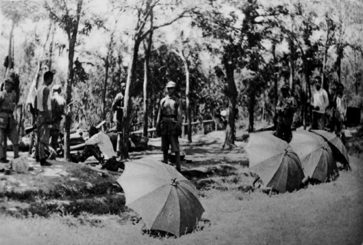 ▲中国军队在树林中休息:当他们在开阔地活动时就撑开雨伞,作为伪装。(1937年)