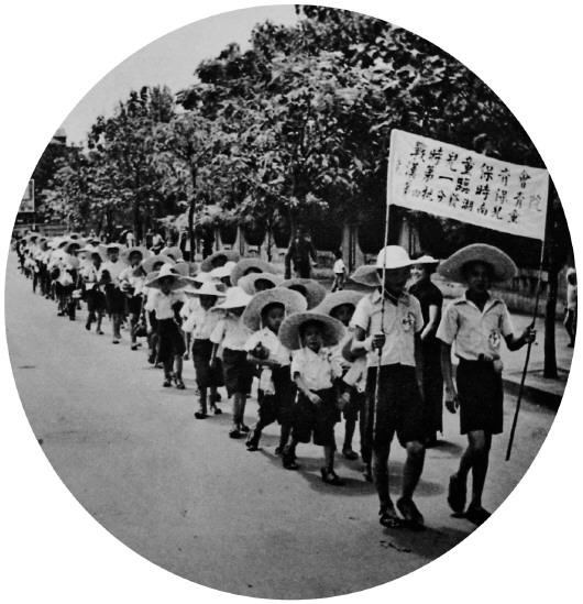 ◤汉口的儿童们列队前往疏散他们的轮船:一队幼童走在大街上,宛如爬行的鳄鱼,领头的两个大孩子举着一面旗帜,上书“战时儿童保育会武汉第一临时保育院第四批分发湖南儿童”。(1938年)