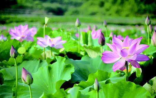 有的荷花被洒上了粉色的颜料,有的荷花被洒上了紫色颜料,还有的荷花被洒上了黄颜料,但又被水冲掉了一些,就成了有点发黄的白荷花。