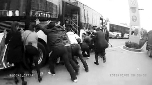 据现场目击群众介绍,6日上午8时50分左右,一辆公交车在这个路口转弯时,在公交车一侧行走的一位老人不慎被卷入车下。“轧着人啦!”不知谁喊了一声,公交车停下后,周边群众发现老人的腿被轧在车下,老人动弹不得。见此情况,公交车内乘客及路上行人都来到公交车一侧齐力抬车。开始的时候只有十几个人,随后几个周边商铺老板也闻讯赶来,路过的行人也都加入到抬车救人中。为了尽快把老人救出,大家不约而同地喊着口号抬车。很快参与救人的热心群众就达到二三十人,看到车下老人被成功拉出,而且身体并无大碍,参加救援的市民才纷纷离开。