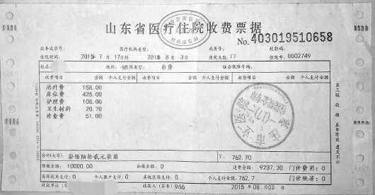 老师提供的医院收费票据。 受访者供图