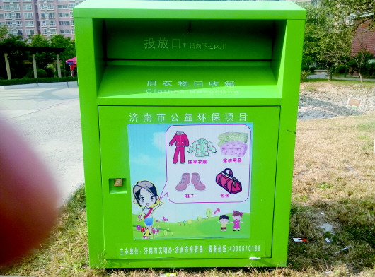 陈经理口中的“又一家”就是山东顺亿博爱基金,在国庆期间已经开始在新世界阳光花园、普照园等小区安装旧衣回收箱,也就是说,到目前为止,济南已经有3家公司在争抢济南旧衣市场。