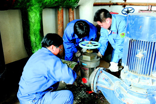 工作人员对供热站进行维修为供暖做准备。资料片