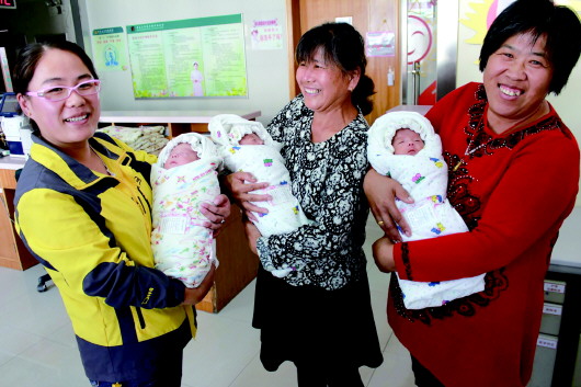 14日,此前在青岛大学附属医院早产四个月的三胞胎恢复健康,成为青岛成功存活的胎龄最小的三胞胎。这三个孩子被护士戏称“小虎队”,图为孩子的妈妈、姥姥、奶奶(从左至右)抱着三胞胎喜不自禁。