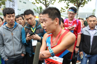 2016中国·枣庄国际马拉松赛男子组季军马明涛在接受媒体采访。马明涛是滨州人,在比赛前一天抵达枣庄时就跑了一个半程马拉松。马明涛说,今天的天气挺好,凉爽舒适,适宜跑马拉松。当马明涛最后冲刺时,周围市民纷纷为这位滨州硬汉鼓掌喝彩。