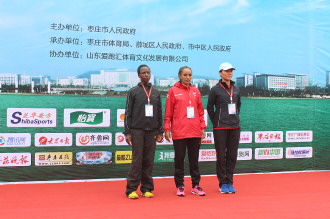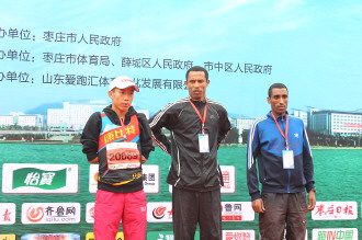 全程马拉松赛女子组前三名上台领奖。左起:季军尤尼丝(来自肯尼亚),冠军比拉图坎(来自埃塞俄比亚),亚军杨金娟(来自枣庄市薛城区)。